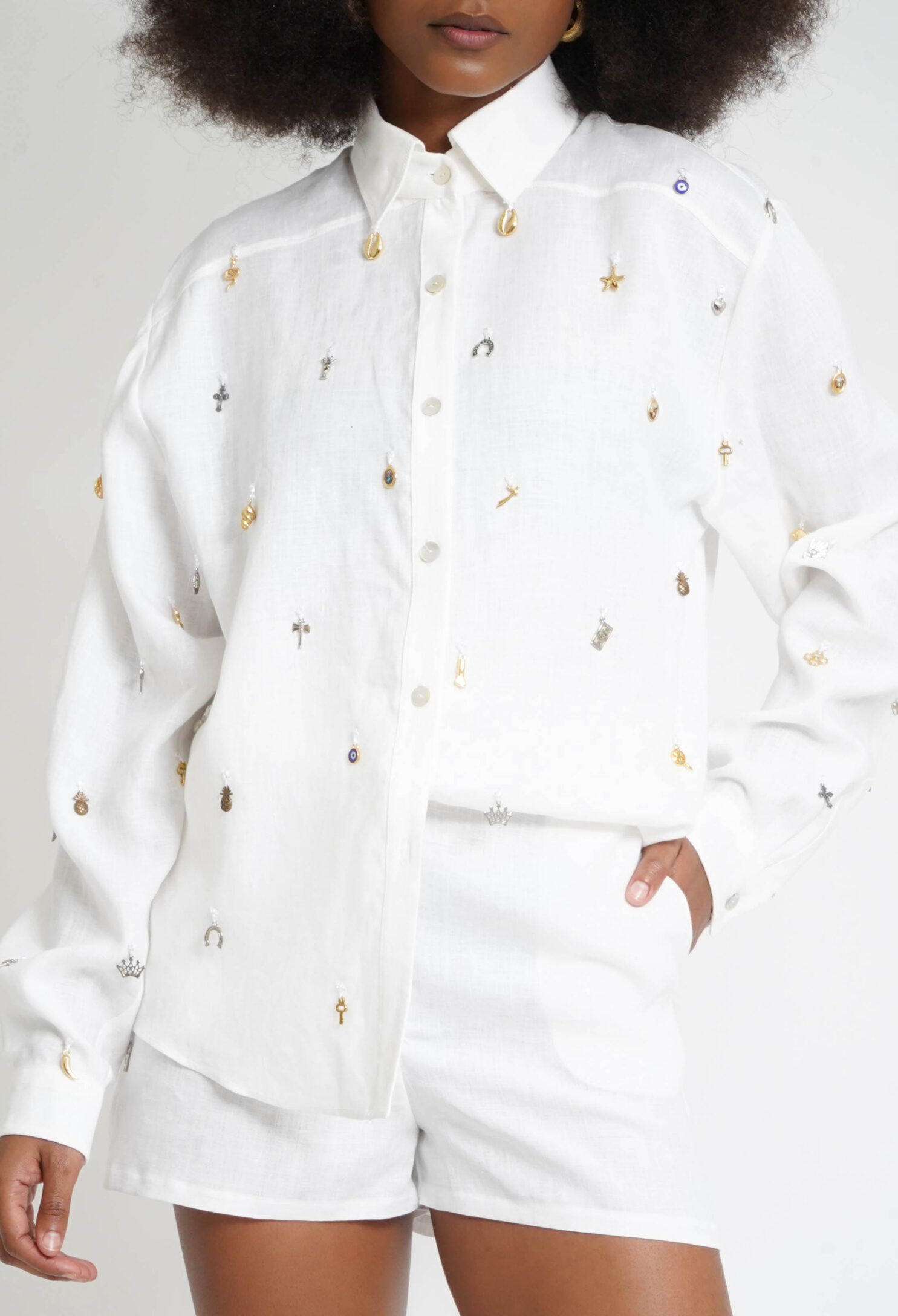 Camisa oversized confeccionada em hemp importado, com acabamento leve e toque natural. O modelo apresenta aplicações manuais de pingentes distribuídos pela peça, criando composições únicas e carregadas de significado. A construção ampla e a modelagem fluida proporcionam movimento e conforto, enquanto os detalhes aplicados reforçam o caráter artesanal e autoral.